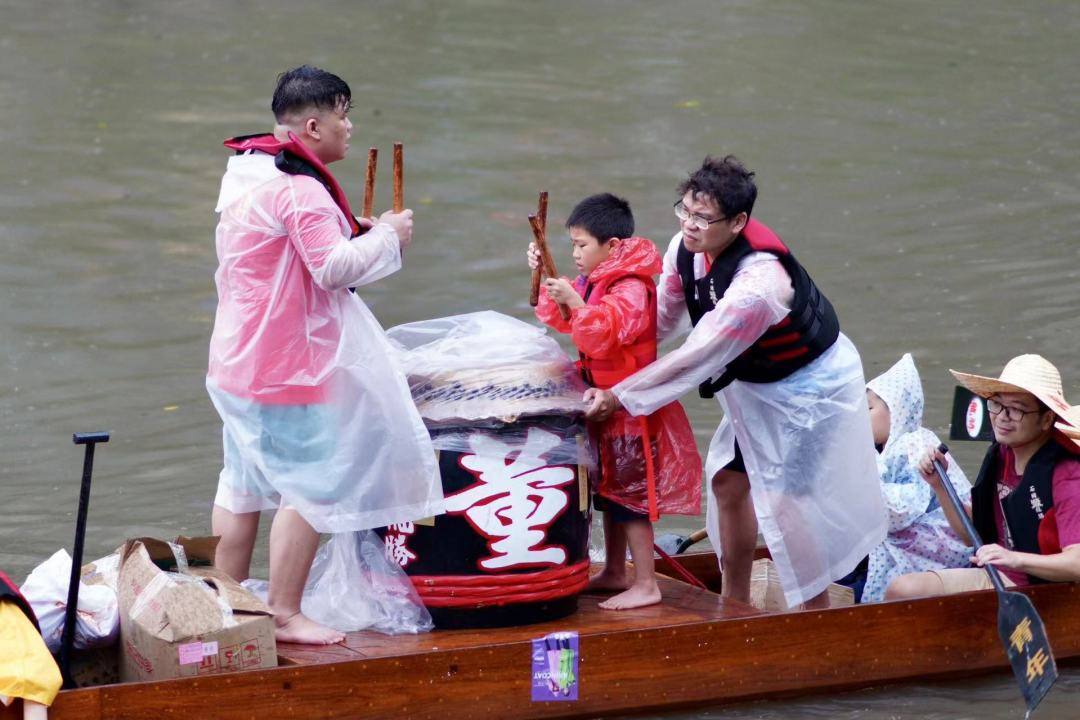 今年的采青活动恰逢六一儿童节,龙船上坐满了身穿迷你龙船衫的小朋友,在长辈的陪伴下,他们有模有样地敲锣、挥旗、划水,龙船还未出发,就已经玩得不亦乐乎。在水花四溅中,交织出一幅“大手拉小手”传承龙船文化的画面。