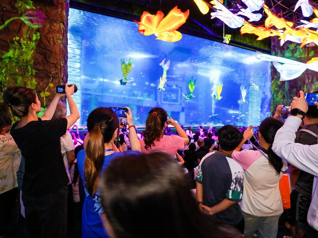 “哇,美人鱼好漂亮!”6月1日,在正佳极地海洋世界,《梦幻美人鱼见面会》上,围满了前来过节的小朋友,他们和美人鱼近距离打招呼、比心互动,跟着美人鱼巡游,玩得不亦乐乎。白鲸、水獭、海象、海狮、水母等海洋动物环绕的海洋馆景区里人气高涨,气氛快乐。