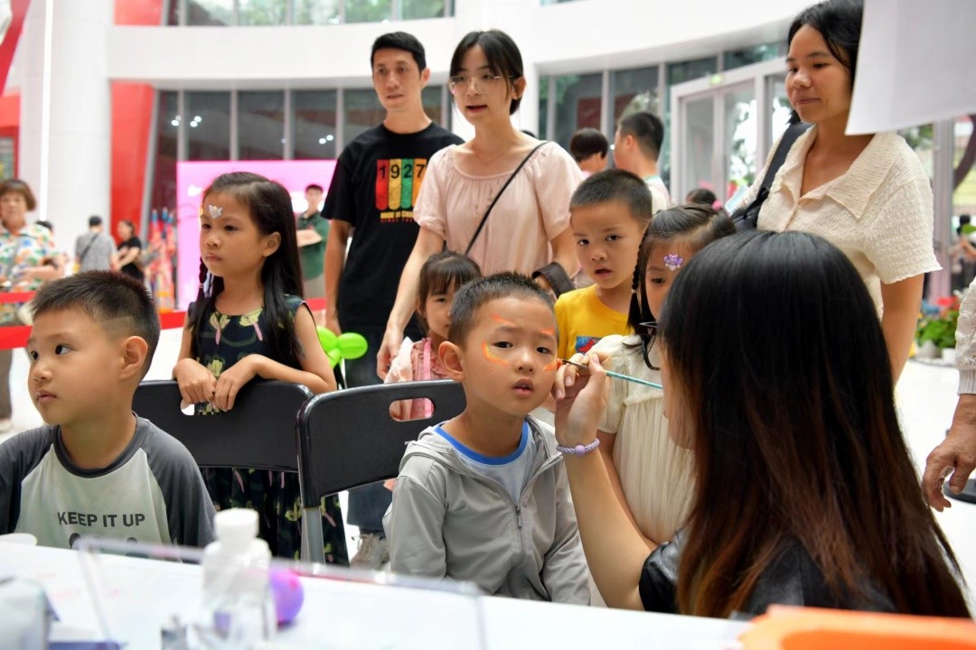 除了精彩的节目展演,主办方还在现场准备了丰富多彩的戏曲体验活动,如为喜爱戏曲的少儿观众提供面部彩绘体验,参观广州粤剧院内的戏曲服饰头饰展。演出开始前,记者观察到,面部彩绘区前颇为热闹,不少父母带小朋友前来体验面部彩绘。根据不同的脸部特征,工作人员为小朋友们量身定制彩绘,经过数分钟的精心绘制,小朋友们脸上纷纷呈现五彩缤纷的图案,颇为可爱。