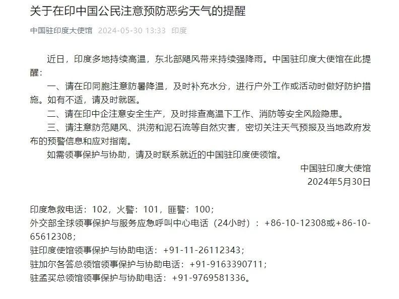 5月30日,中国驻印度大使馆提醒在印中国公民注意预防恶劣天气。