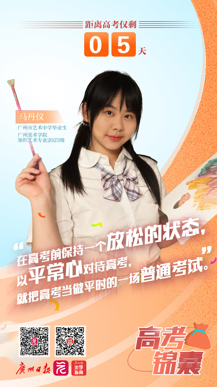 今天是6月2日,距离2024年高考仅剩5天。本期“高考智囊团之倒计时锦囊”,我们邀请到了广州美术学院2023级染织艺术专业学生、广州市艺术中学毕业生马丹仪,为备战高考的同学们带来她的心得和祝福!