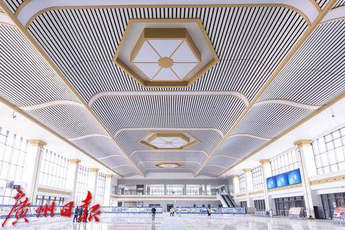 兴宁南站站房建筑面积近1万平方米,车场规模为2台5线。装修设计秉承融合、传承、创新理念,采用斑斓花灯、客家围屋文化元素。用抽象出的屋脊做条板造型,同时利用抽象的花灯造型在中间穿插形成秩序感,墙面采用客家围屋的柱子、窗花造型装饰,突出地域文化特点。