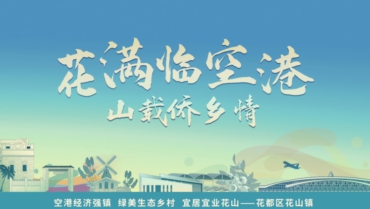 花山镇宣传画采用天蓝色调,刻画了花山小镇、香草世界、蓝莓培育基地、白云国际机场等地标元素,描绘了花山——空港经济强镇、绿美生态乡村的美好图景。