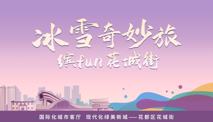 花城街宣传画采用粉紫色调,刻画了迎宾广场、融创文旅城、图书馆等地标元素,描绘了花城街——国际化城市客厅、现代化绿美新城的美好图景。