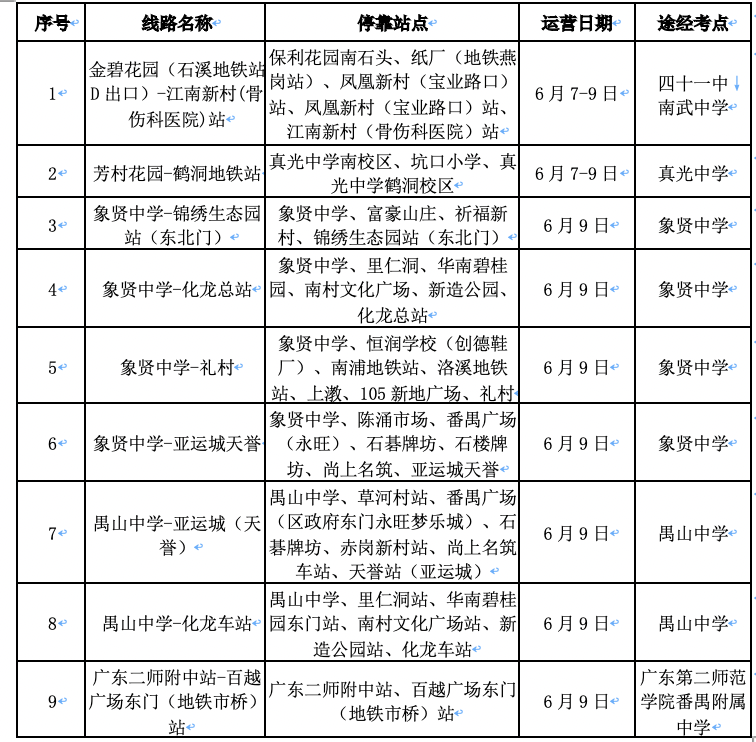 据介绍,广州巴士集团推出包括芳村花园至鹤洞地铁站、象贤中学至锦绣生态园站、广东二师附中站至百越广场东门(地铁市桥)站等9条高考如约专线,定制服务共覆盖6个高考考点,为考生赴考出行保驾护航。