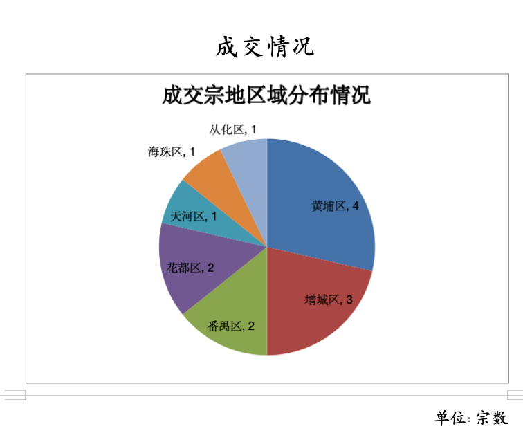 从成交宗地区域分布情况来看,黄埔区4宗,增城区3宗,番禺区和花都区各2宗,天河、海珠、从化区各1宗;从成交宗地类型分布来看,工矿仓储用地9宗,商服用地4宗,住宅用地1宗。