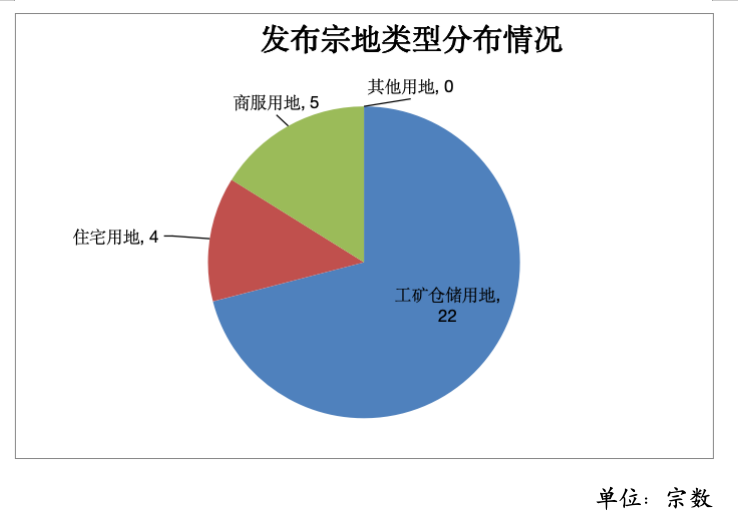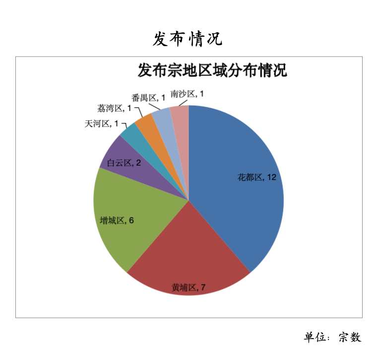 发布地块方面,花都、黄埔、增城数量位列前三,分别为12宗、7宗、6宗,其余白云、天河等区合计6宗;从发布宗地类型分布来看,以工矿仓储用地为主,共22宗;其次是商服用地和住宅用地,分别为5宗和4宗。