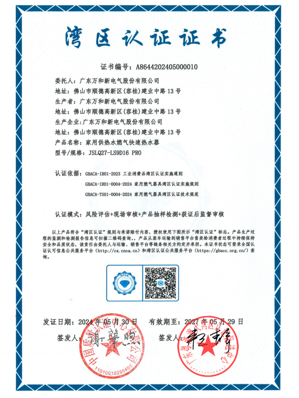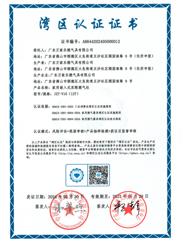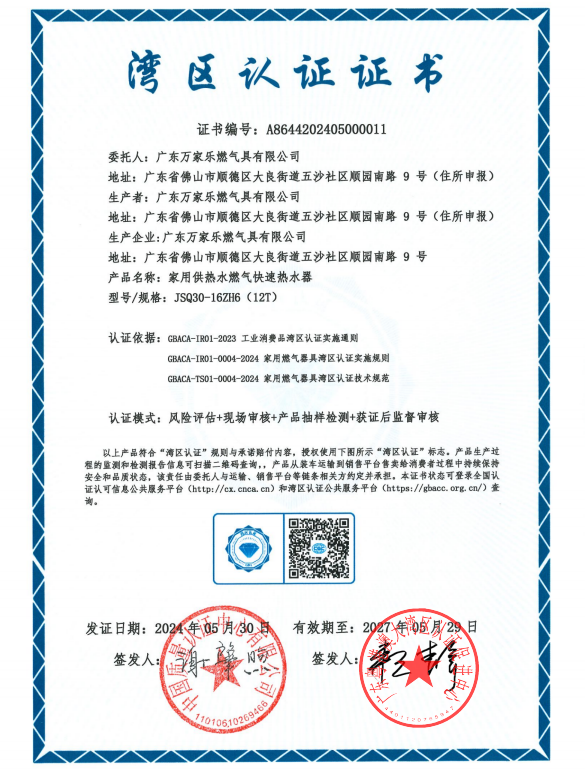 日前,广东粤港澳大湾区认证促进中心发出广东首批家用燃气具产品《湾区认证证书》。来自佛山市顺德区的企业广东万家乐燃气具有限公司生产的家用供热水燃气快速热水器(规格型号JSQ30-16ZH6(12T))、家用嵌入式双眼燃气灶(规格型号JZT-V10(12T))以及广东万和新电气股份有限公司生产的家用供热水燃气快速热水器(规格型号JSLQ27-LS9D16 PRO)等三种产品获颁《湾区认证证书》。