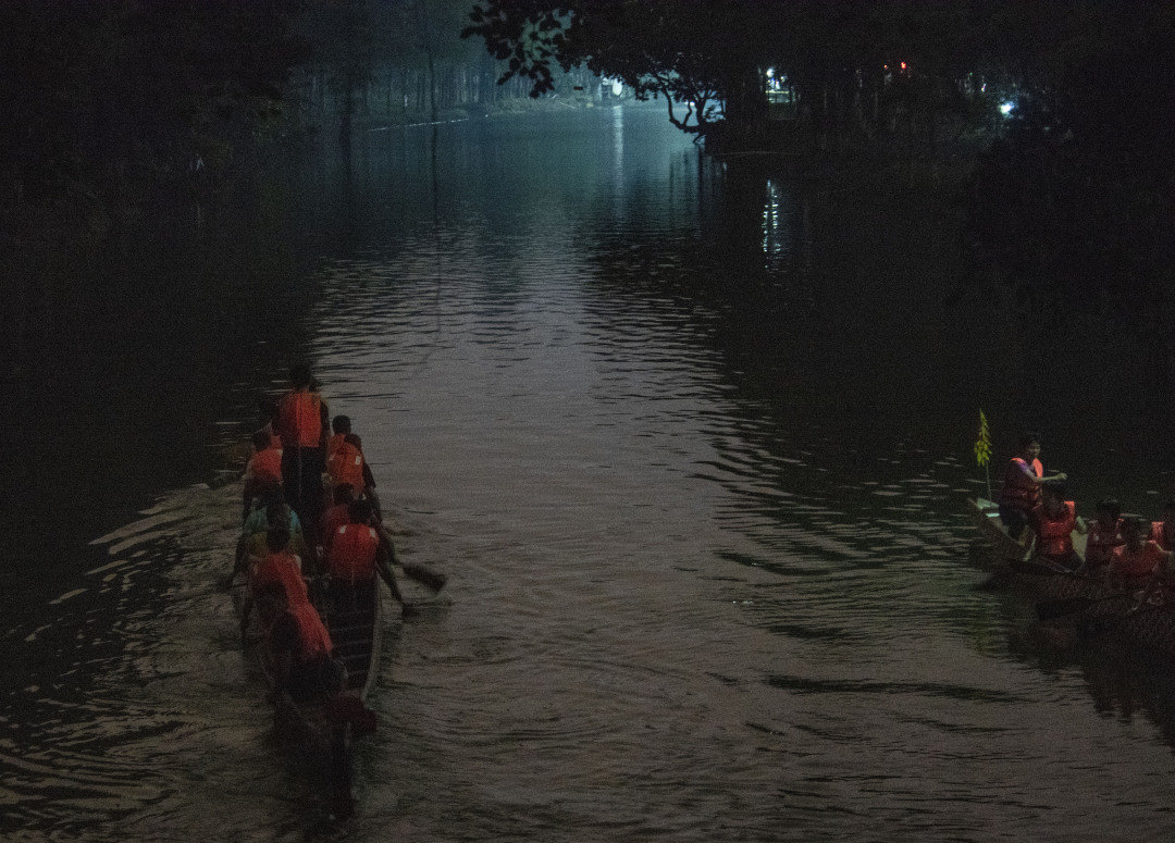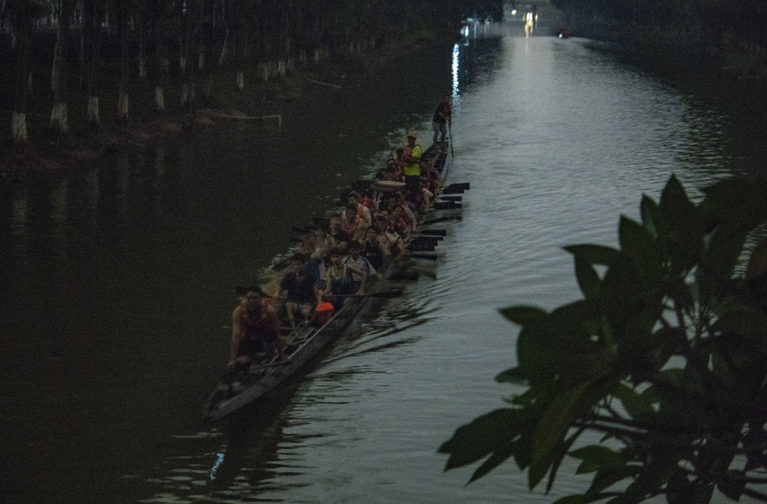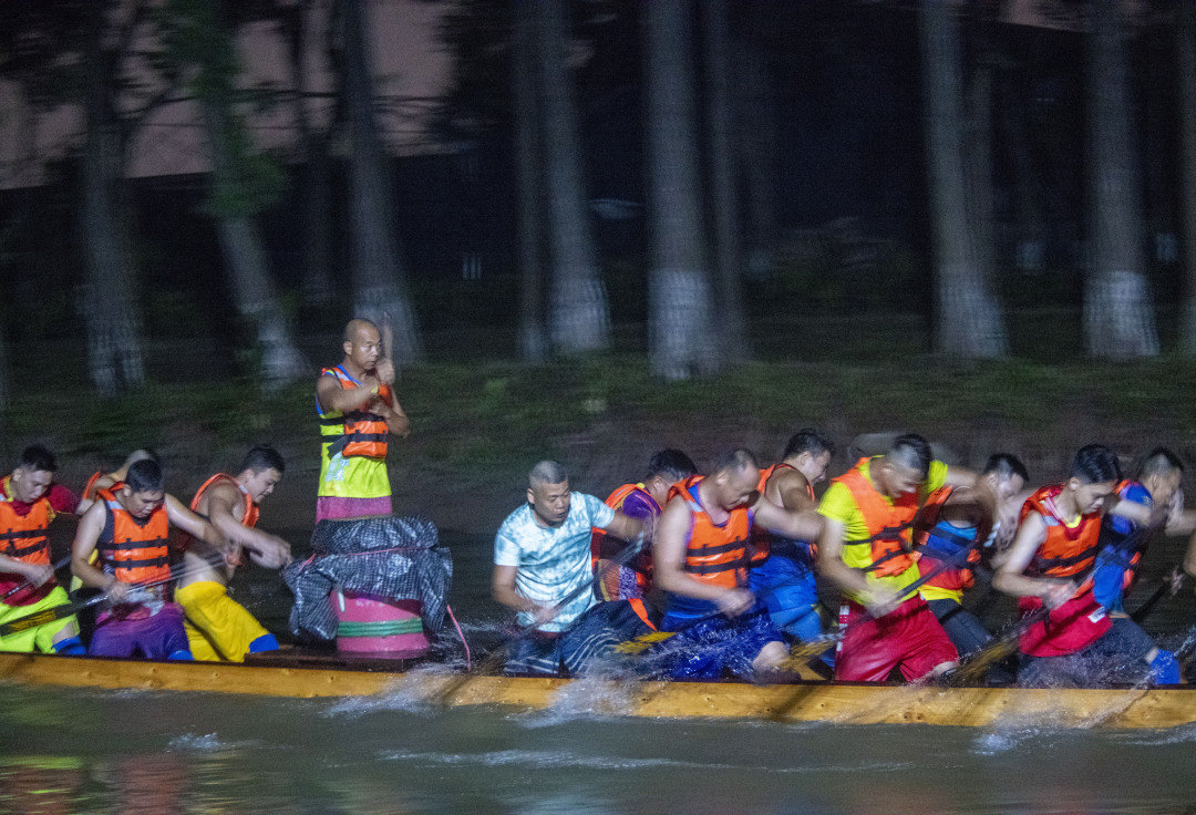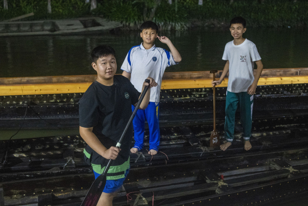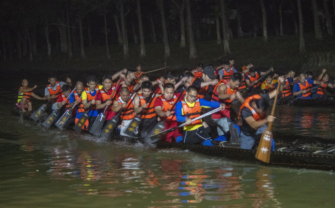 “咚咚咚咚咚”,龙船鼓响起,在静夜里格外清脆。以鼓为令,扒仔们奋起加速、整齐划一,谁都不想因下桡不用力被教练点名。往北去几乎没有路灯,只看得清树影、船影、人影,夜训变成了一幅水墨画:几只龙船在水面折返,扒仔们所经之处,会开出一道银白的水浪,扒仔救生衣上的点点荧光成为画面中的亮点。