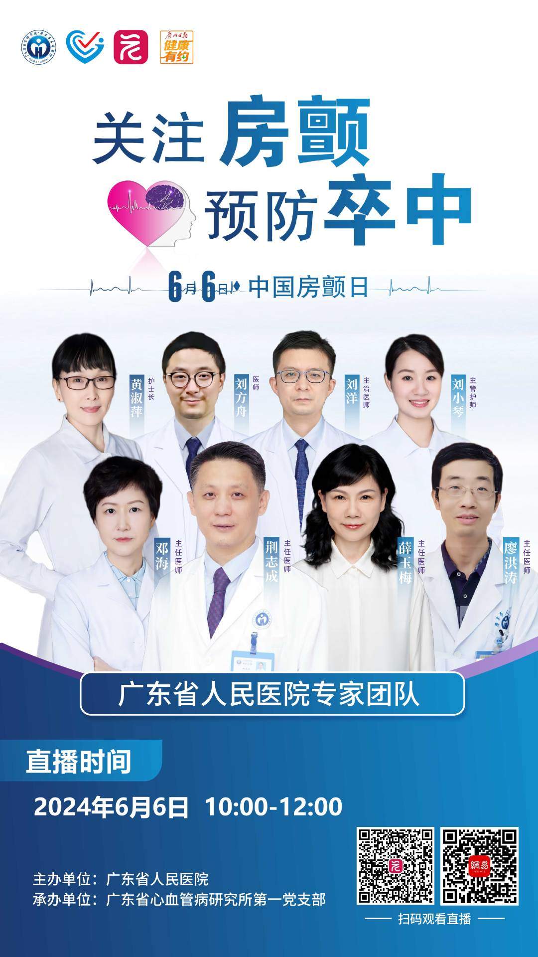 为了提升公众对房颤的认知水平,进一步推动房颤的早期发现与合理治疗、提高自我管理能力,广州日报健康有约联合广东省人民医院特别推出《关注房颤,预防卒中》的名医微课,届时,来自广东省人民医院心血管名医团队平常“一号难求”的专家们将集体上线,给大家科普房颤相关知识,并现场答疑解惑,大家千万别错过!