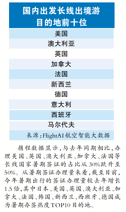 “今年航班多了,票价也便宜了,准备这个暑期带孩子去美国旅游。”在市民李女士看来,从经济账算,与其去几次三五天的东南亚、日韩,不如将预算集中在一起,体验时间更长的深度旅行。FlightAI航空智能大数据显示,今年暑运,旅客长线出境游意愿依旧高涨,搜索指数较去年同期上升22%。长线出境游中,家庭出行旅客是暑运期间的出行主力,且占比较去年同期有所上升,幅度为36%~43%。