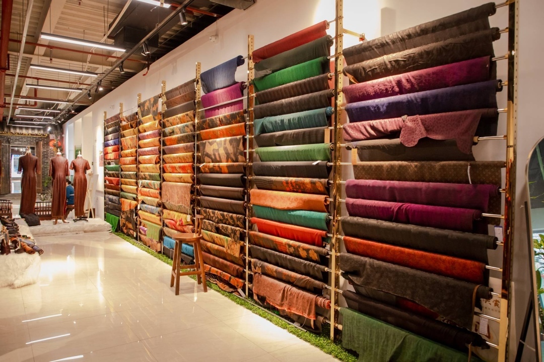 在她的身后,分门别类地陈列着的各式香云纱布料、男女成衣,还有以香云纱面料制成的头饰、拎包、鞋子等产品,玲琅满目,色彩丰富。在室内照明的光影之下,这些香云纱产品,真丝的光泽若隐若现,如水丝滑细腻,质感奢华。