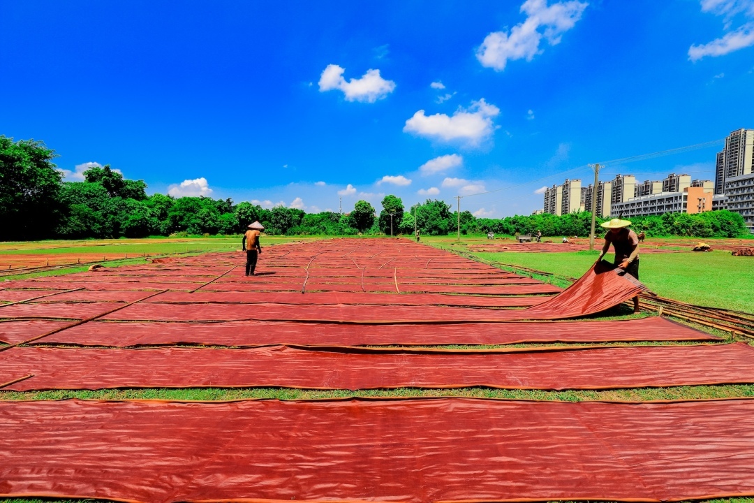 这是广东顺德一个晒莨厂日常可见的景象。这些绸缎经过了一种名为薯莨的汁水浸泡,经阳光晒制,薯莨汁的色素则会沉淀其上,与河泥一同凝聚其中。历经“三蒸九煮十八晒”繁复工艺,数月锤炼后,吸收“天地精华”的面料不仅经久耐穿,易洗耐脏,甚至具有防蚊虫抗过敏的功效。