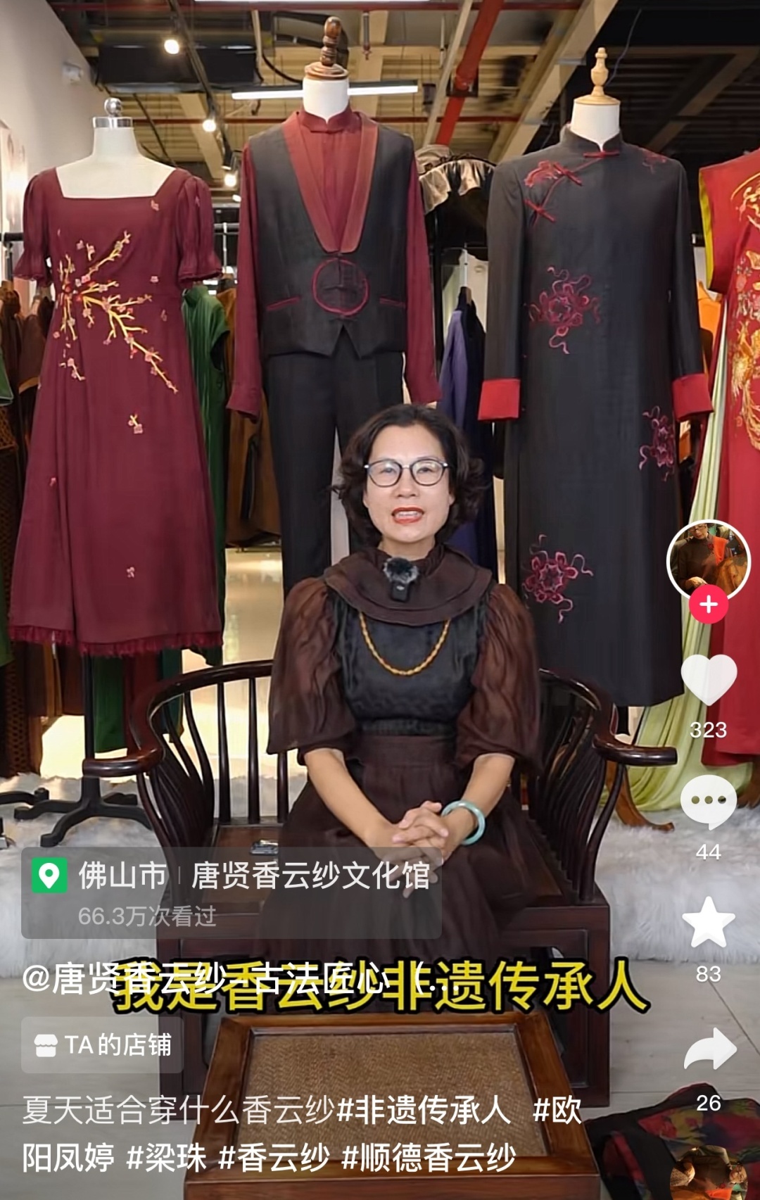 如今,欧阳凤婷将香云纱的故事带到线上,在抖音@唐贤香云纱-古法匠心(大师姐) 的短视频和直播间,她讲述着香云纱的“前世今生”,也将优质的香云纱在抖音电商上架,让更多人看到、买到好的香云纱。