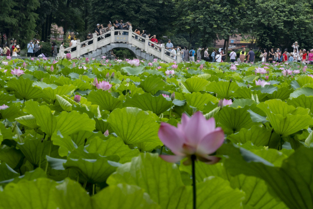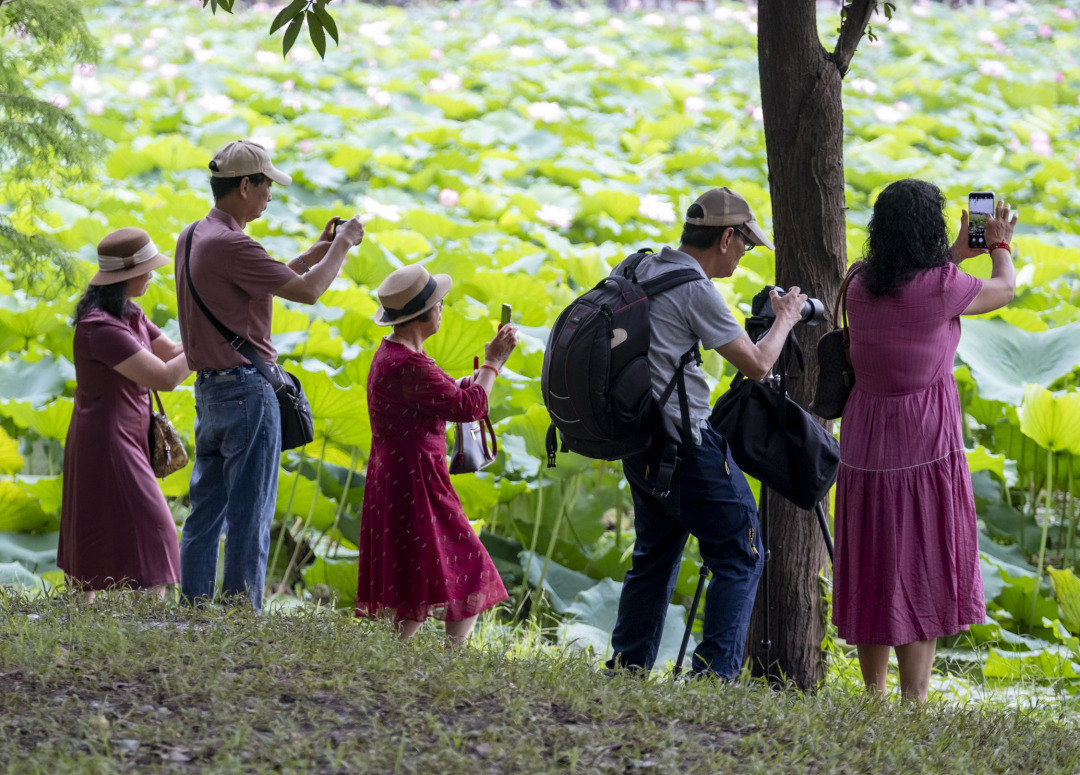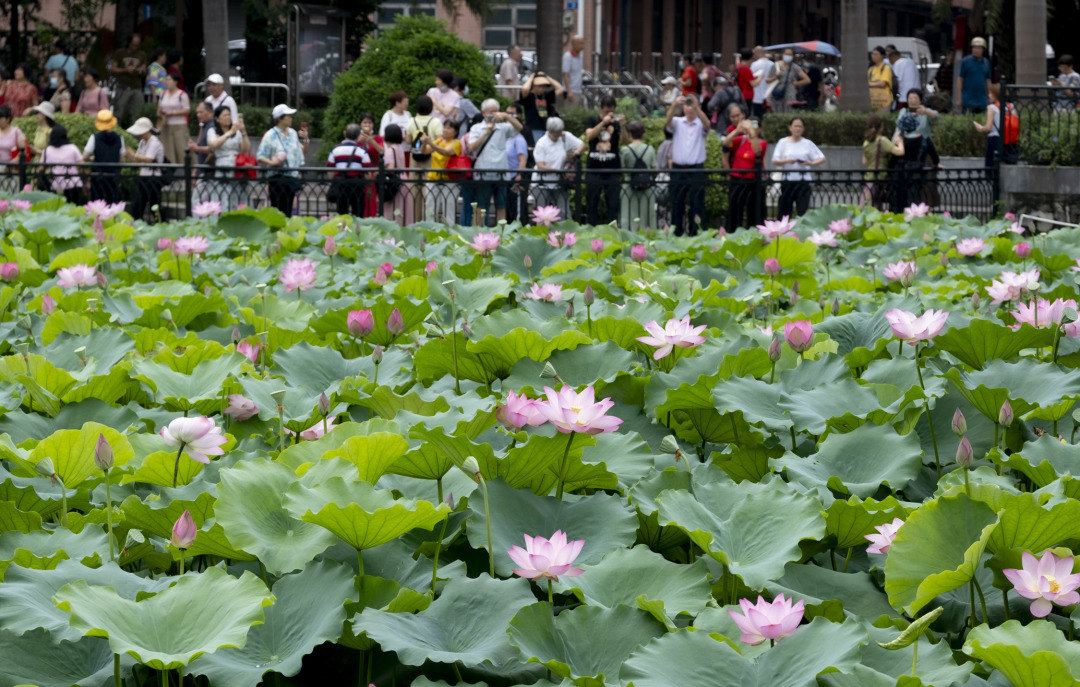 端着长枪短炮的摄影发烧友一边创作,一边交流拍摄荷花的经验。盛装打扮的阿姨们,或撑着油纸伞,或手执绢布扇,不断变换造型拍照发朋友圈。音乐爱好者在连廊上吹起萨克斯,在池塘边唱起粤剧,吸引了素不相识的“花粉”随意加入。大家各得其乐,场面十分热闹。