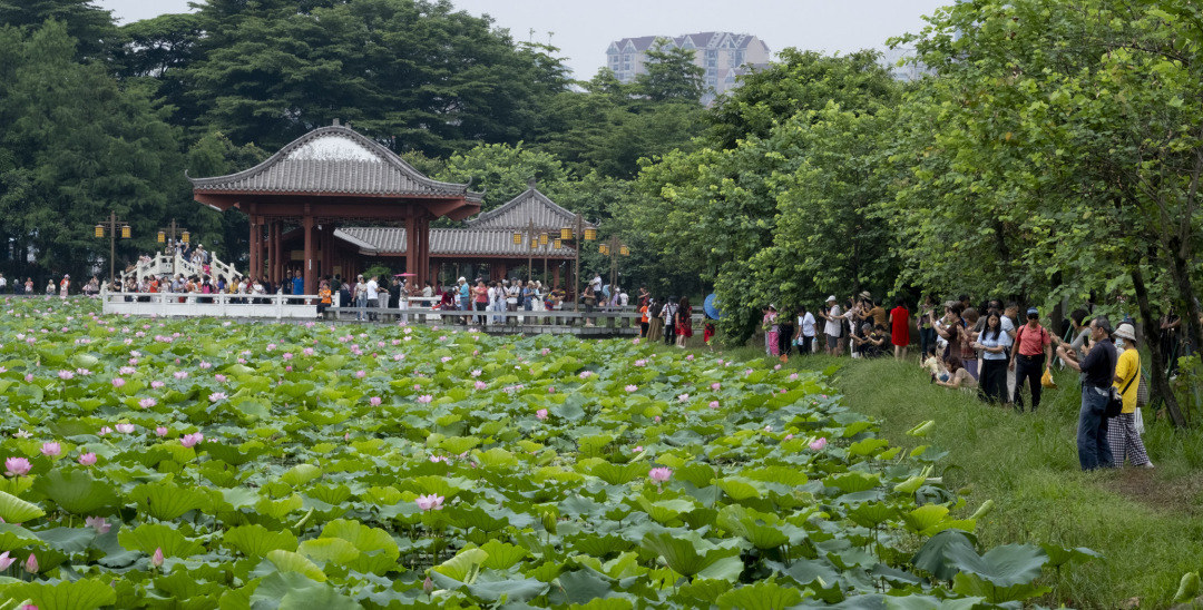 6月5日,记者来到位于螺涌北街的螺涌公园,放眼望去,一派“青荷盖绿水,芙蓉披红鲜”的景象,美不胜收。亭台轩榭里,石桥长廊上,甚至池塘边有些泥泞的小路上,游人如织。