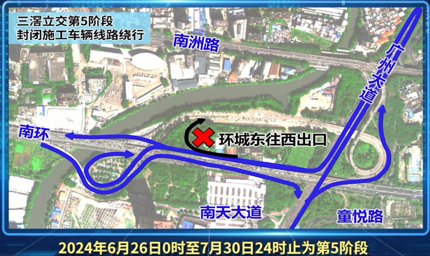 第五阶段施工时间为今年6月26日至7月30日,将封闭环城高速三滘立交东往西出口匝道,环城高速三滘立交西往东出广州大道北匝道和广州大道南进入南环需绕行。