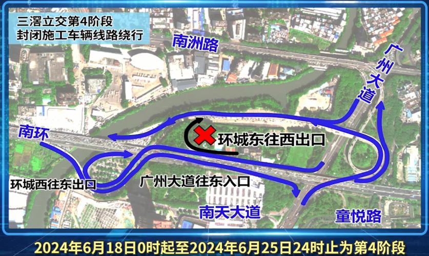 第四阶段施工时间为今年6月18日至25日,将封闭环城高速三滘立交东往西出口匝道,环城高速三滘立交西往东出广州大道北需绕行。
