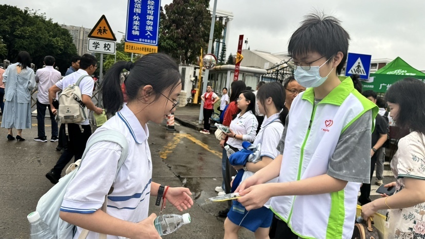 “同学,送你一个助考书签!高考加油,旗开得胜!”“今天天气预报有雨,大家有需要可以来我们这领取一次性雨衣。”