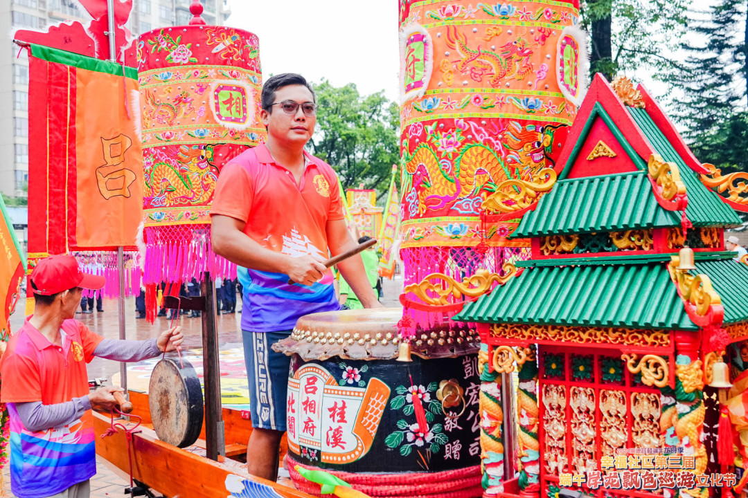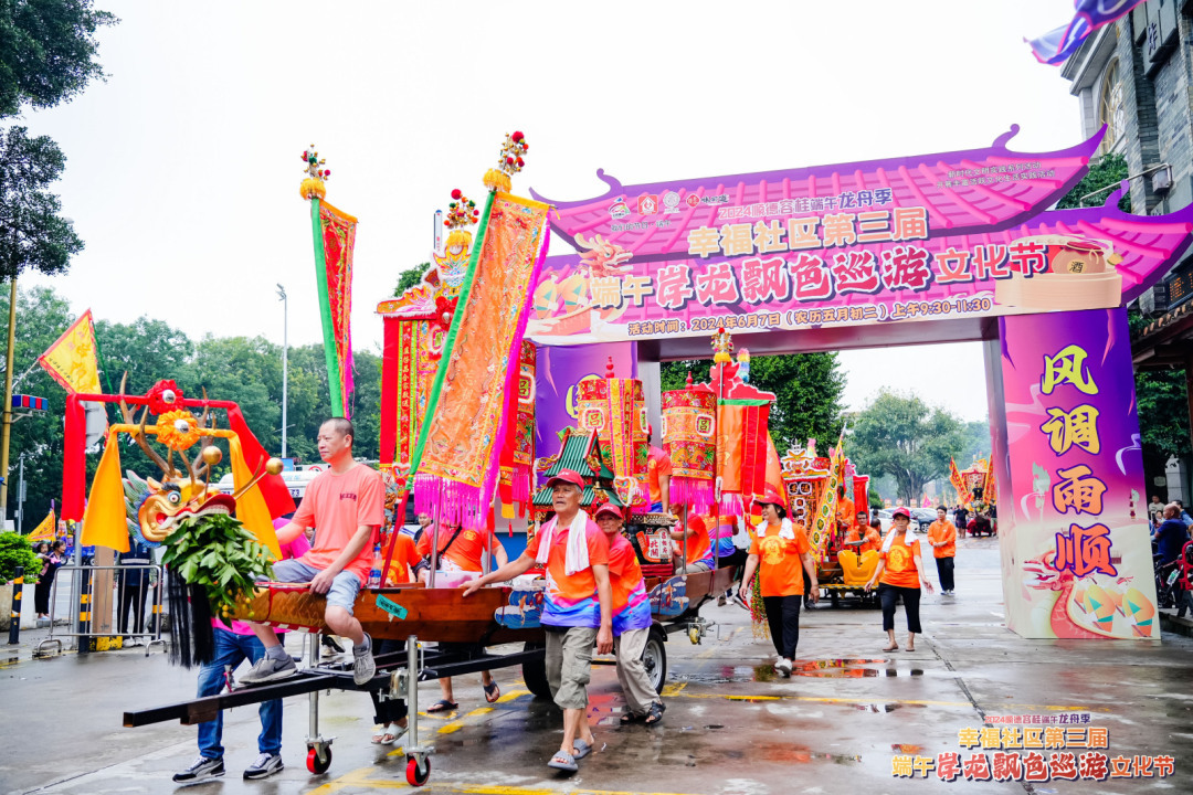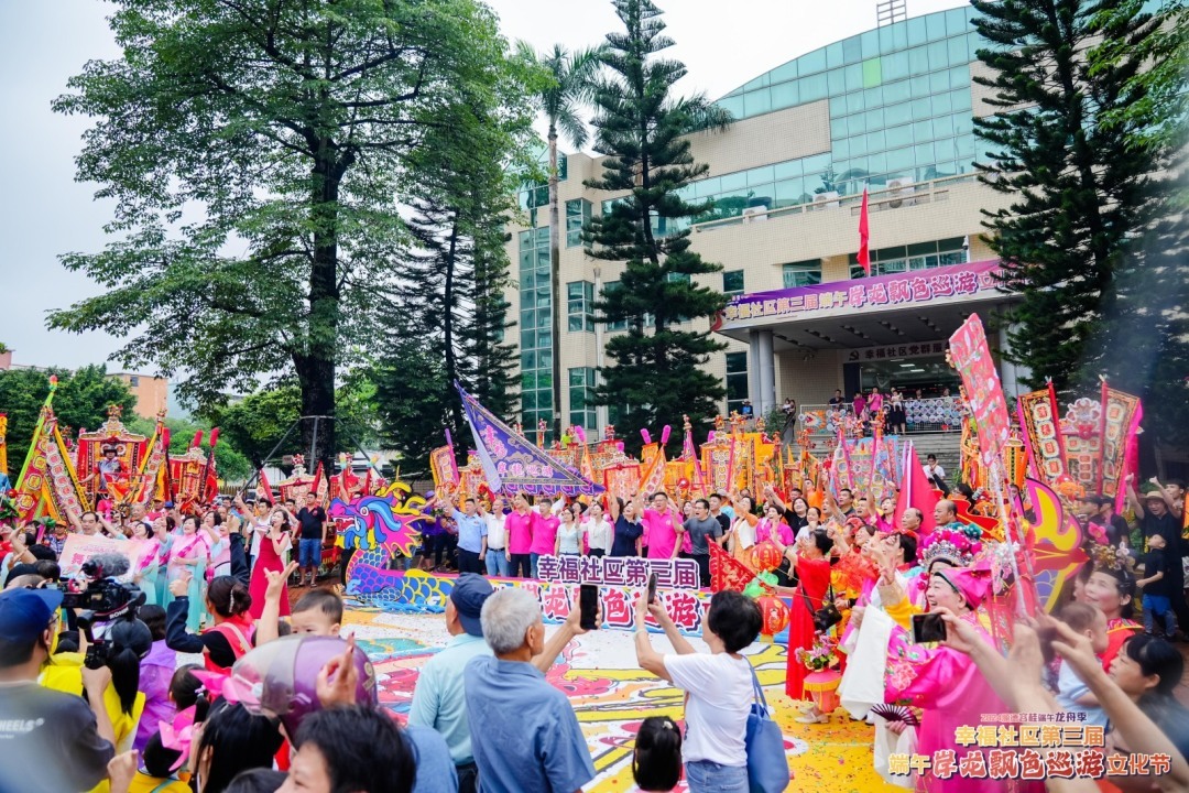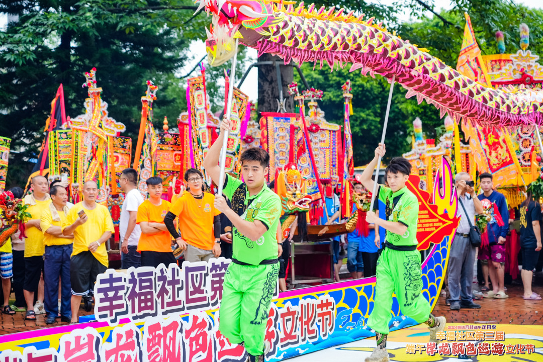 值得一提的是,今年的幸福社区端午岸龙飘色巡游文化节再度升级,巡游队伍不断壮大,吸引了19艘岸龙岸凤参加;队伍类别也由原来单一的岸龙巡游方阵增加了舞龙舞狮、飘色、亲子、舞蹈等特色巡游方阵。此外,现场增设了社区文创产品以及特色传统美食摊位,让现场市民朋友过足瘾。