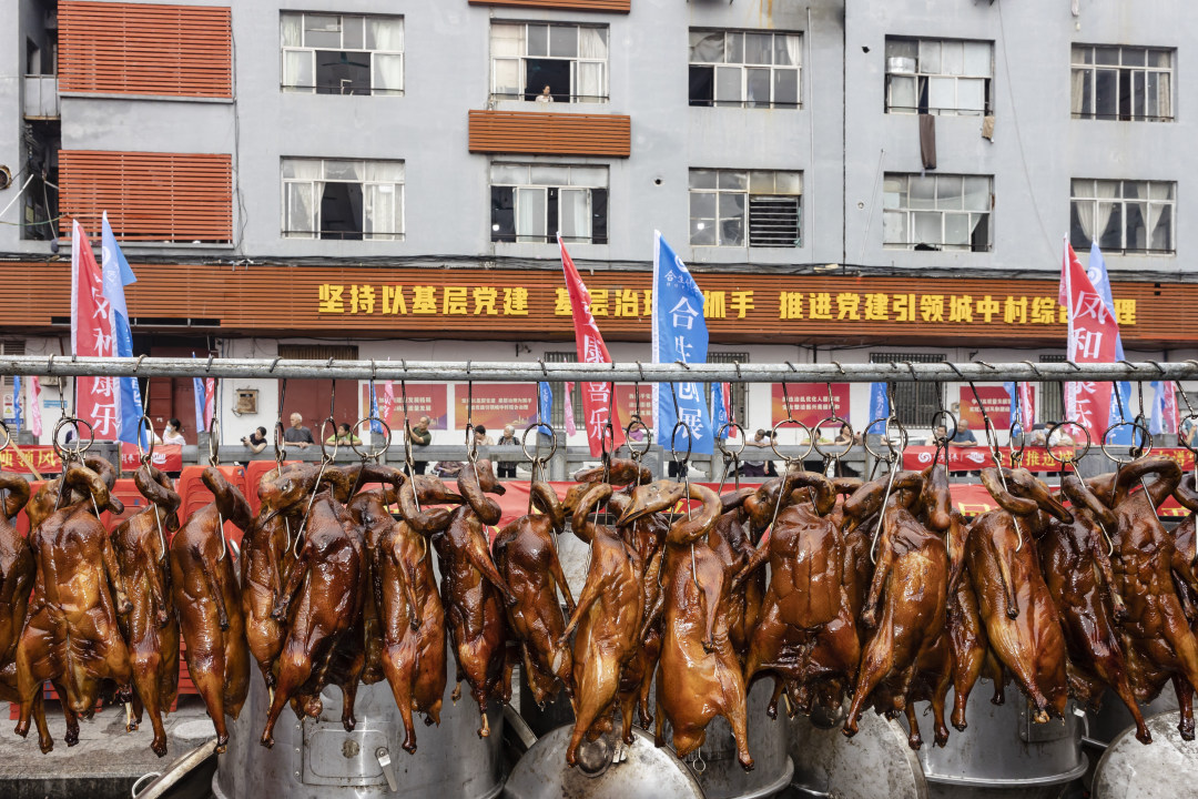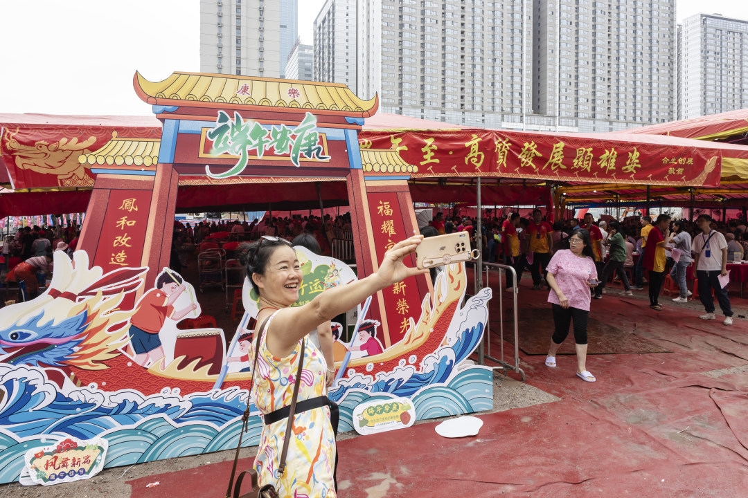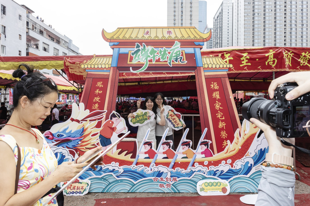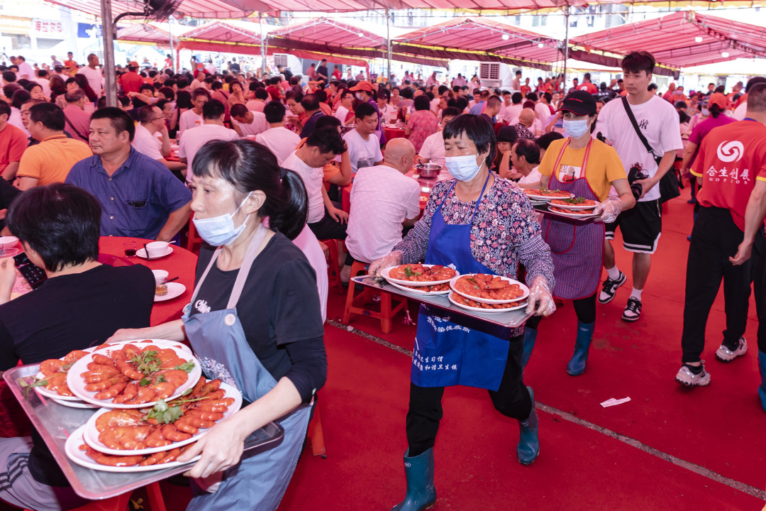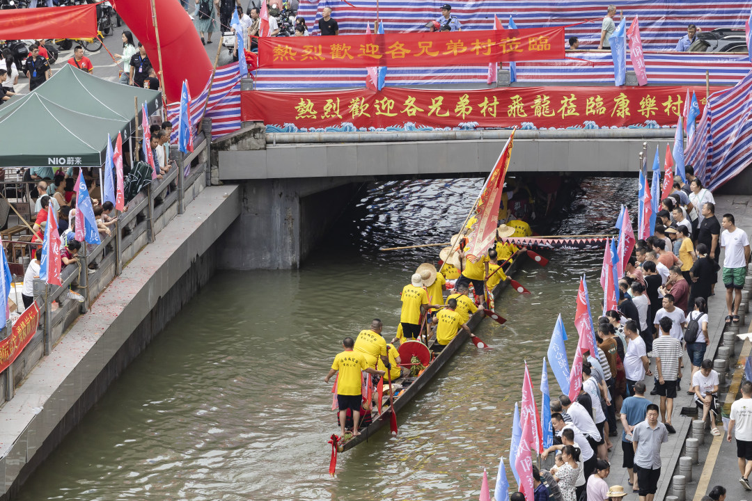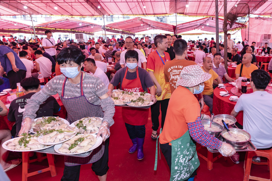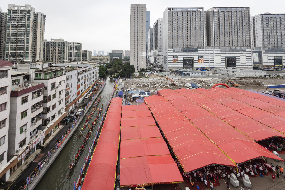 6月7日五月初二,广州海珠凤和联社康乐村举办龙船景,康乐村的两条飞龙在康乐涌上与前来“探亲”的兄弟村飞龙相会。与往年不同的是,今年凤和康乐龙船饭的规模是历来最大,在首期复建安置区拆卸地块上筵开370席,除了广州本地的兄弟村,东莞、江门、清远等地的兄弟村也专程来吃龙船饭,热闹非凡。