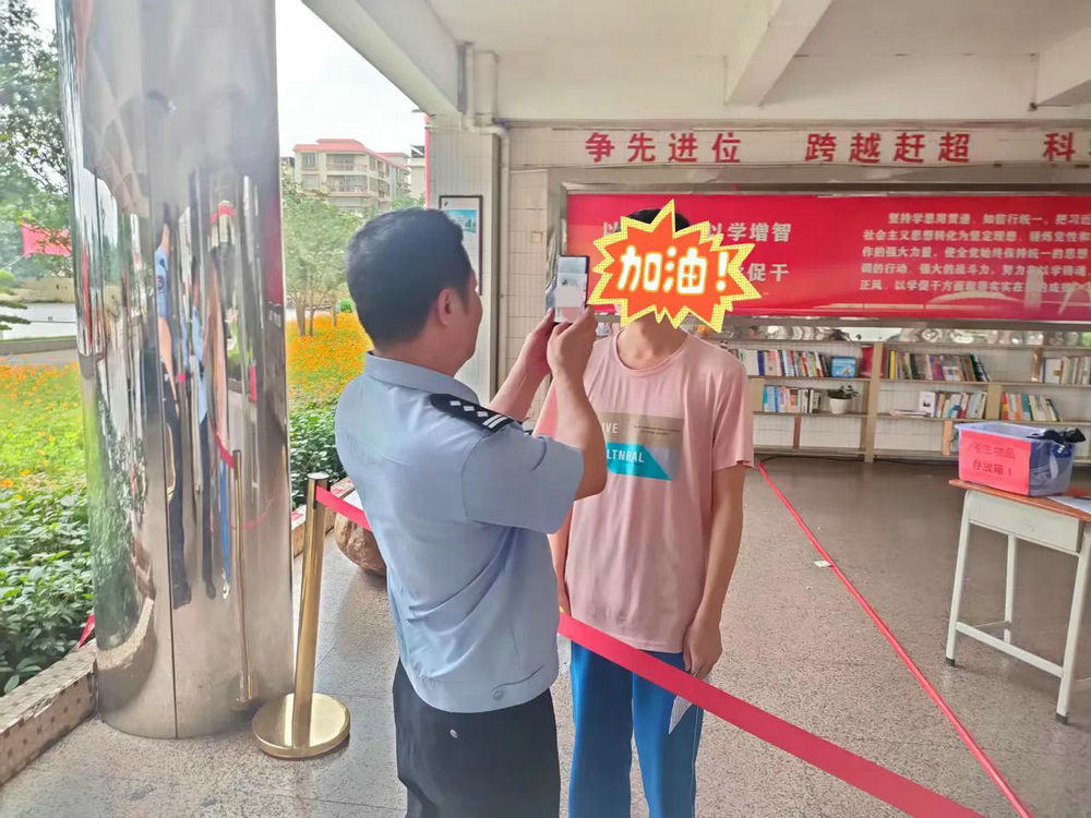 当日上午8时许,郁南县蔡朝焜纪念中学高考服务点,执勤民警为一名丢失身份证的考生提供现场身份核验服务,随即帮助该名考生开启“绿色通道”加快身份证的补办,保障考生顺利参加高考。
