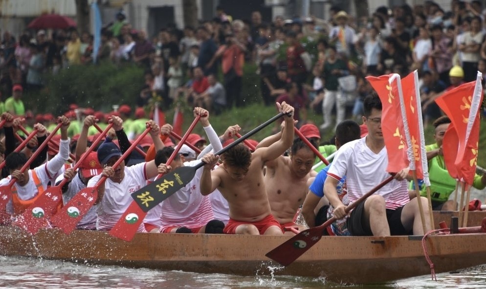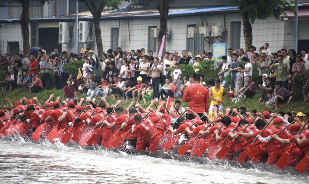 中午12时许,20多艘龙船开始在河面来回巡游,展示风采。巡游一段后,龙船开始竞渡,只见两艘龙船飞速而来,你追我赶,不甘落后,比赛一时斗得难分胜负。