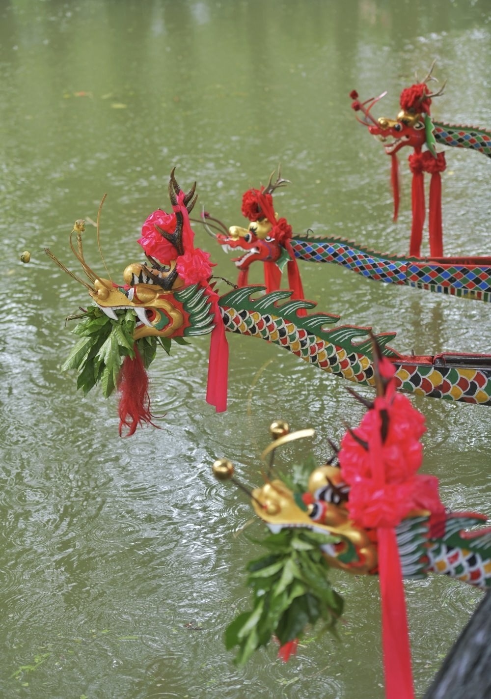 龙船景不光比速度,还比龙船的装饰和表演技艺。因此20多艘龙船都精心打扮,船头戴上大红花,船尾挂上鲜花,船身插上彩旗,宛如一条条彩龙在水中穿梭,十分神气。