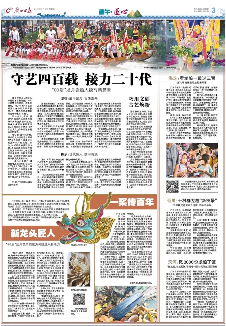 潜心造“龙”400余载,吕家已成为当地远近闻名的“龙舟世家”,澄海近九成龙舟均产自此处。如今,24岁的吕铭接过接力棒,成为吕家龙舟制作技艺的第20代传人,他正通过申报非遗、创新宣传等形式,让这项古老的龙舟制作技艺焕发新活力。
