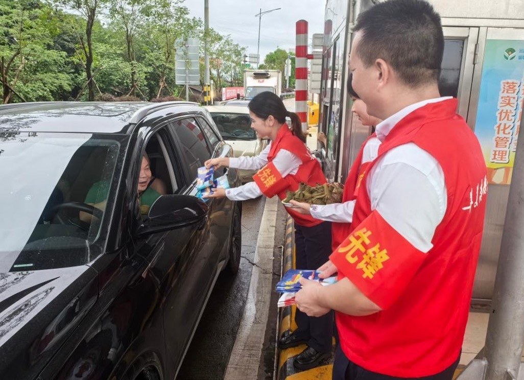 在云路收费站收费广场,志愿者们将亲手制作的粽子分发给过往的司乘,并向过往司乘发放交通安全知识宣传单,宣传道路交通安全知识,耐心讲解高速公路行车安全注意事项、超限超载及疲劳驾驶的危害等知识,引导广大司乘安全文明出行。本次活动共发放交通安全知识宣传单400余份,派送粽子100个、罗汉果茶约200份。