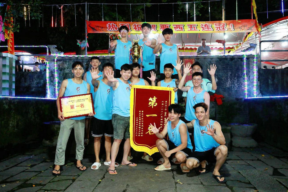 比赛结束的傍晚时分,要西村沉浸在一片喜悦之中。村内悬挂着“热烈庆祝要西五连冠”的横幅,一百多席丰盛的“龙船饭”已经准备就绪,一字排开,迎接着归来的扒丁们。