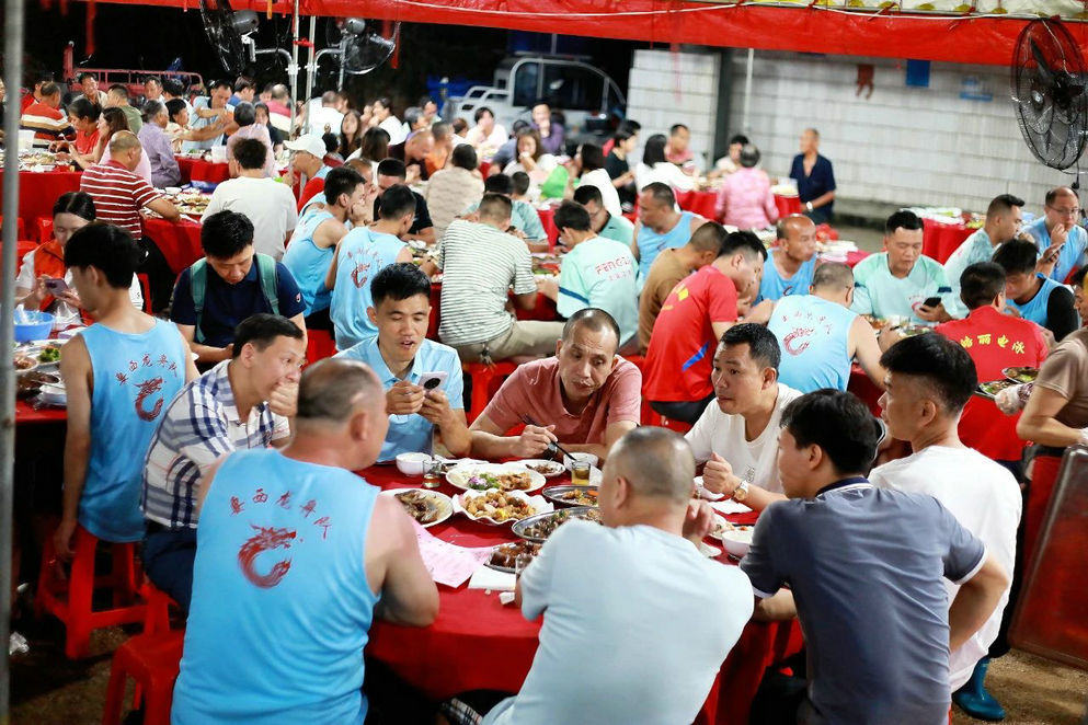 “龙船饭”上,村中的历代扒丁和村民们欢聚一堂,共话乡情,分享着荣誉与喜悦,鼓励后辈继续传承和发扬赛龙舟精神。