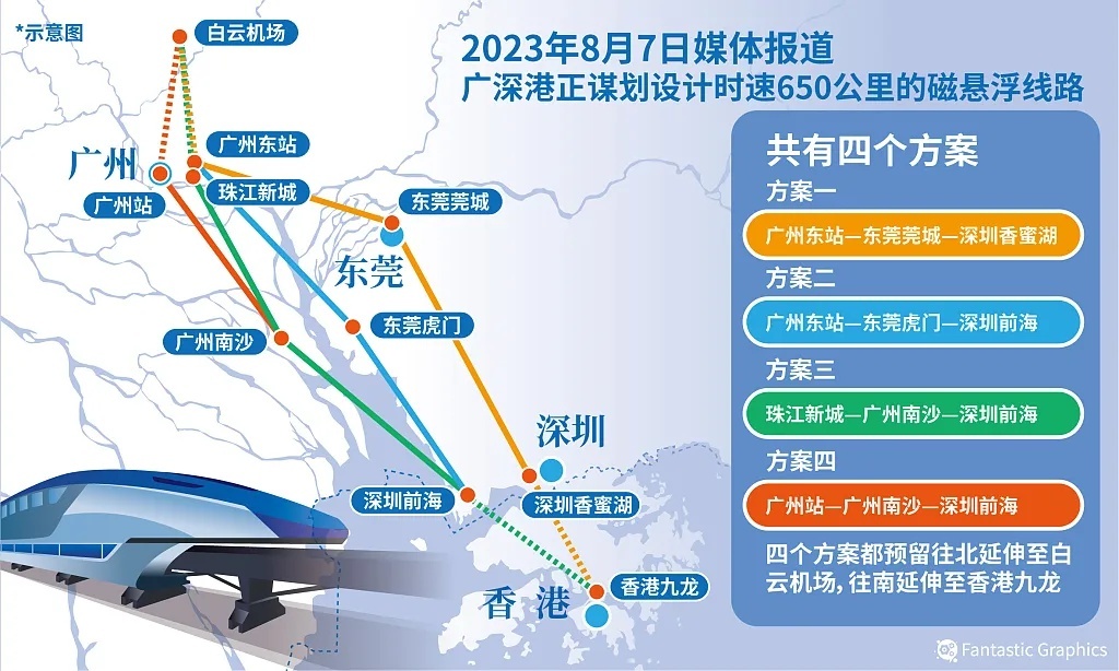 《广州市综合立体交通网规划(2023—2035年)》透露,广州正超前谋划与其他超大城市间高速磁悬浮通道布局及实验线建设,预留京港澳高速磁悬浮,沪(深)广高速磁悬浮2条通道。