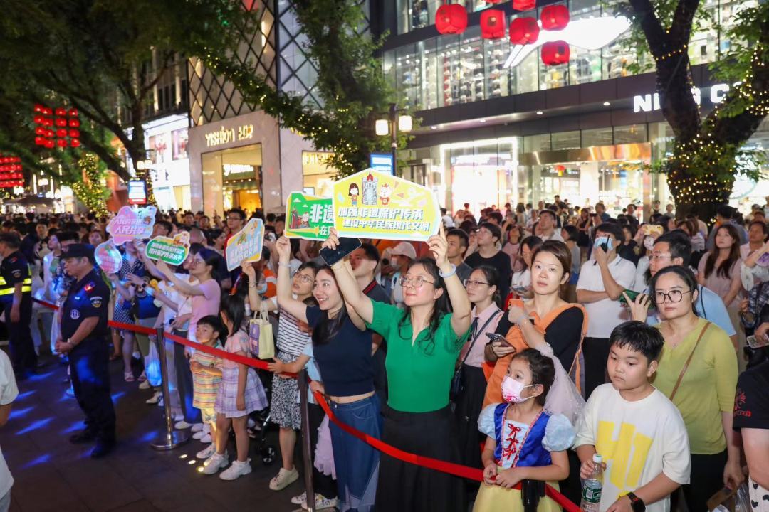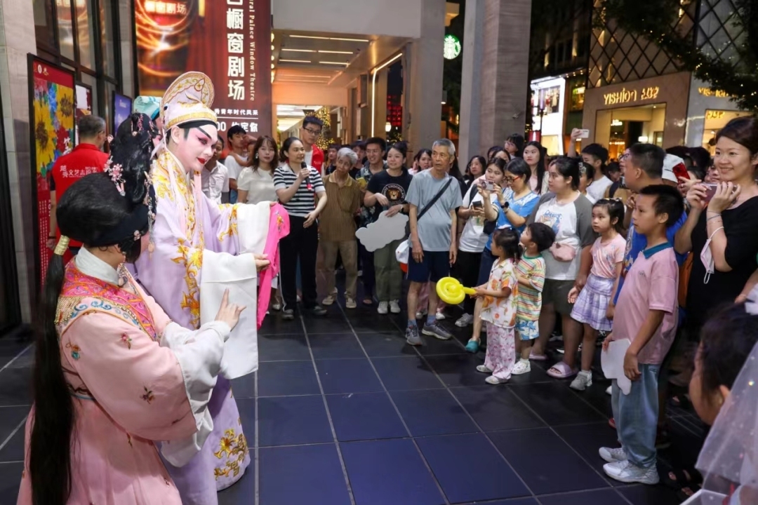 “倘我他朝得志,不弃一介之士,使各尽其才共请缨,支撑大厦永不倾……”来自广东粤剧院的国家二级演员康健带领一众优秀青年演员上演了《伦文叙传奇·纱巾情》《花田错会》等经典粤剧折子戏,古调悠长、曲韵婉转,吸引过往市民游客纷纷驻足观赏。粤剧作为粤方言区最具影响力和海外最具代表性的中国戏曲剧种之一,被称为“广东大戏”“广府戏”,已有300多年的历史。2009年,粤剧被联合国教科文组织列入“人类非物质文化遗产代表作名录”,今年正是15周年。粤剧邂逅北京路千年古道,经典魅力与时代活力交融,延续千年城脉、文脉、商脉,广大市民游客在北京路体验一场奇妙的“非遗之夜”。