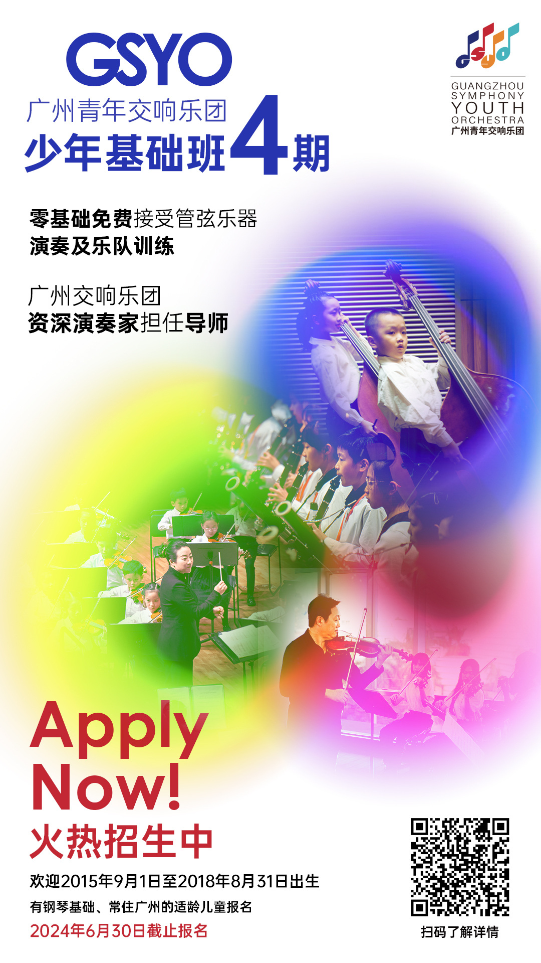 由广州市人民政府与广东省文化和旅游厅合作共建的广州青年交响乐团(简称“广青交”)自4月启动“少年基础班”4期招生以来吸引了众多学生家长的关注。常住广州、今年9月在读1至3年级、具有钢琴基础及音乐潜质的小学生均可报考“少年基础班”4期,入选者将从零基础开始免费接受专业规范的乐器演奏技术训练。报名信息在广州青年交响乐团公众号及官网发布,6月30日截止报名。