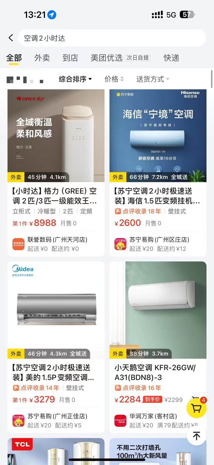6月11日,记者定位广州市海珠区某写字楼,登录美团App搜索“空调2小时达”可以看到,入驻店铺以数码专卖店或商超为主,除了苏宁易购,还有联誉数码、华润万家等门店,涵盖美的、格力、志高、小米、TCL、小天鹅、长虹、海信等多种空调品牌。
