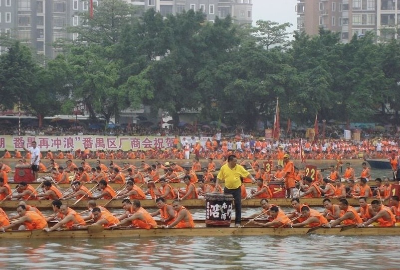 在番禺从农历五月初一开始一连七天都有“龙船景”,五月初一石岗景,五月初二傍江景,五月初三新桥景,五月初四沙墟景、新造景,五月初五沙头景、潭山景,五月初六莲湖景,五月初七北海景。