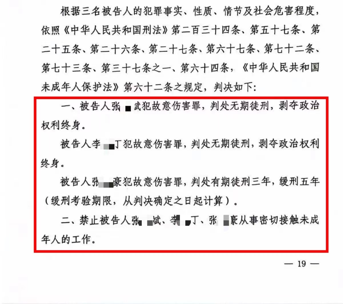 综上,判决被告人张某斌犯故意伤害罪,判处无期徒刑,剥夺政治权利终身。被告人李某丁犯故意伤害罪,判处无期徒刑,剥夺政治权利终身。被告人张某豪犯故意伤害罪,判处有期徒刑三年,缓刑五年。禁止被告人张某斌、李某丁、张某豪从事密切接触未成年人的工作。