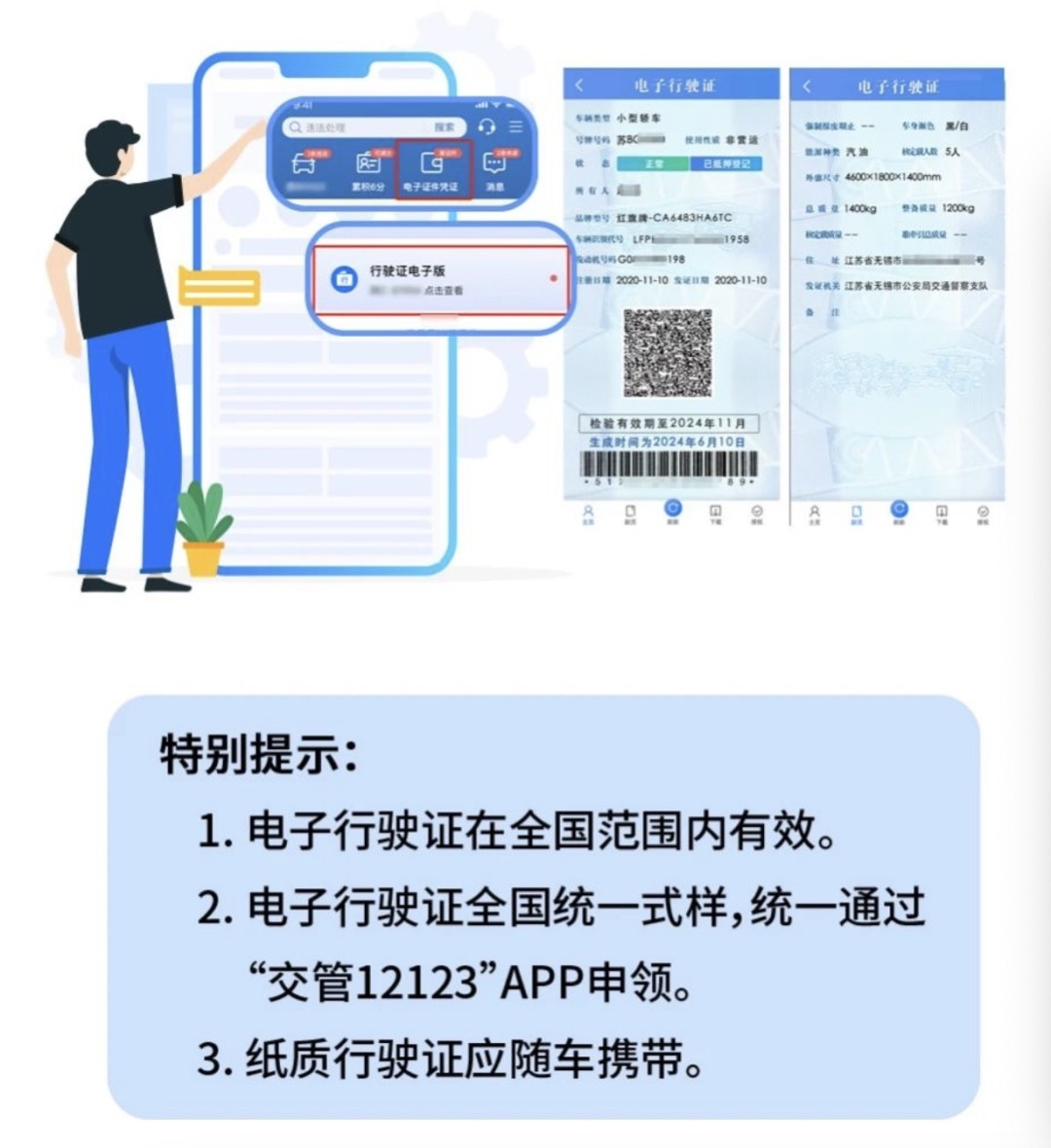 公安部交通管理局特别提示:电子行驶证在全国范围内有效。电子行驶证全国统一式样,统一通过“交管12123”APP申领。纸质行驶证应随车携带。