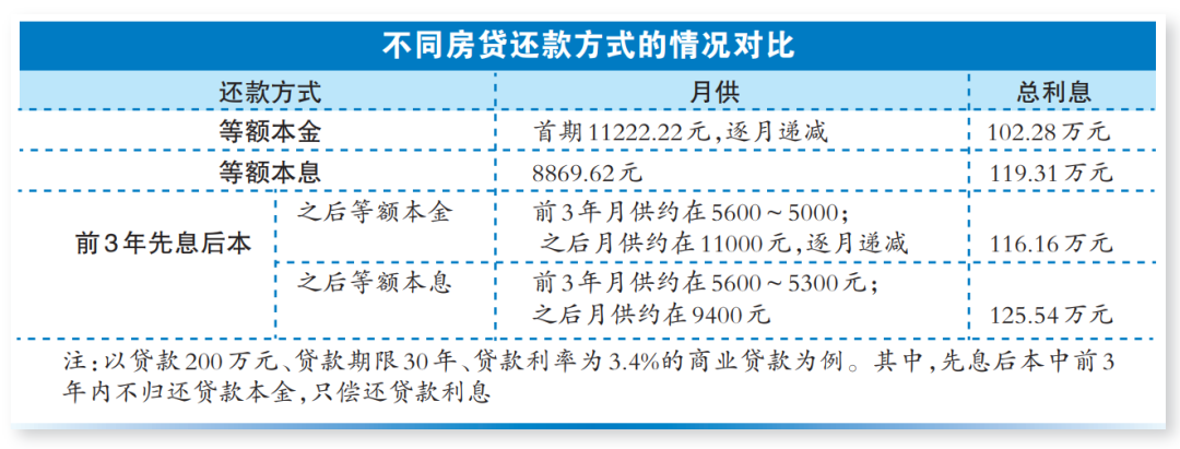 此外,对于另外两种主流房贷还款方式——等额本息和等额本金,又是如何选择呢?肖文晓表示,等额本息,即把按揭贷款的本金总额与利息总额相加,然后平均分摊到还款期限的每个月中,在利率不变的情况下,每个月的月供是一样,比较适合希望降低初期还款压力的人群,特别是收入处于上升期的年轻人;等额本金,是贷款人将本金分摊到每个月内,同时付清上一交易日至本次还款日之间的利息,在整个房贷周期内月供走势前高后低,适合还款能力较强、希望能够减少整体利息支出的人群,也就是说,等额本金模式能够减少利息总额,更加划算。而“先息后本”,实质上也是银行和还款人协商,先还几年的利息,之后再按约定的“等额本金”或“等额本息”继续还款。