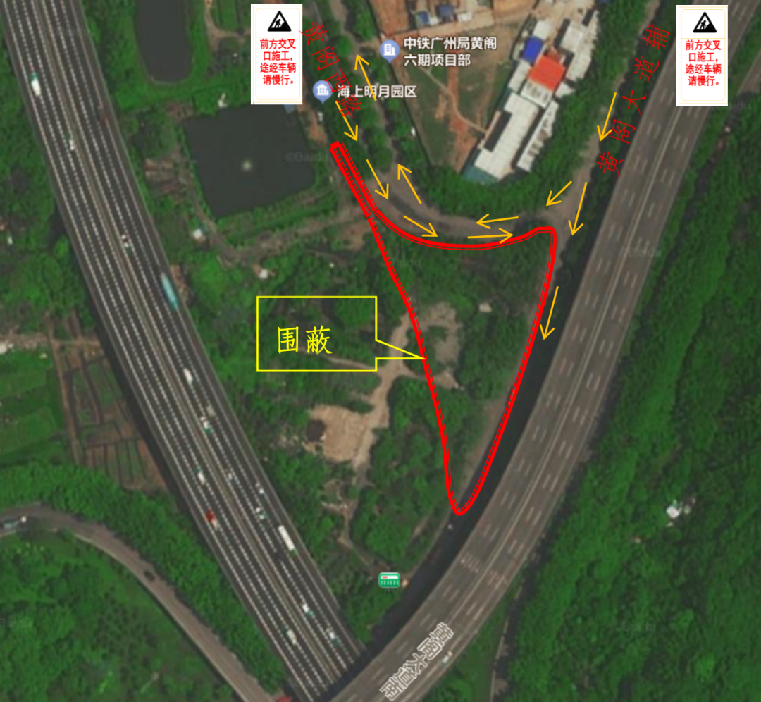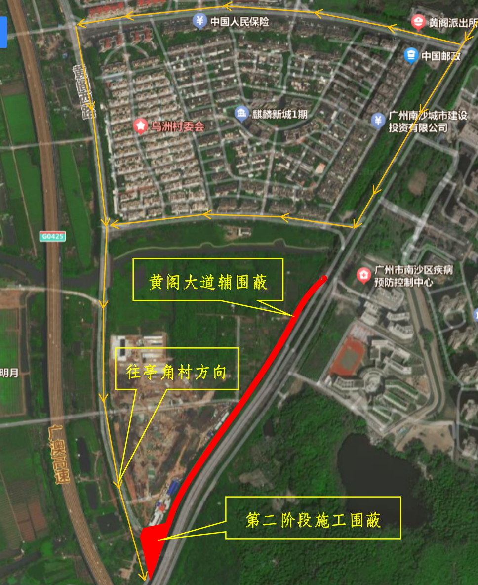 第二阶段围蔽施工期间,社会车辆、行人前往亭角村需在黄阁大道提前由麒村路或南涌口路绕行经过黄阁西路。