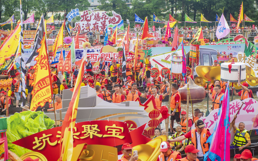 6月15日上午,荔湾区花地河(东漖大桥—剑沙水闸河段)两岸人潮涌动、彩旗飘舞、锣鼓喧天。这个龙舟季,继荔枝湾“五月五 龙船鼓”民俗文化活动、荔湾区龙舟邀请赛之后,广州荔湾区压轴举办“龙腾花地,荔湾有景”——2024年端午游龙活动,再现20多年前盛极一时的东漖龙船景。