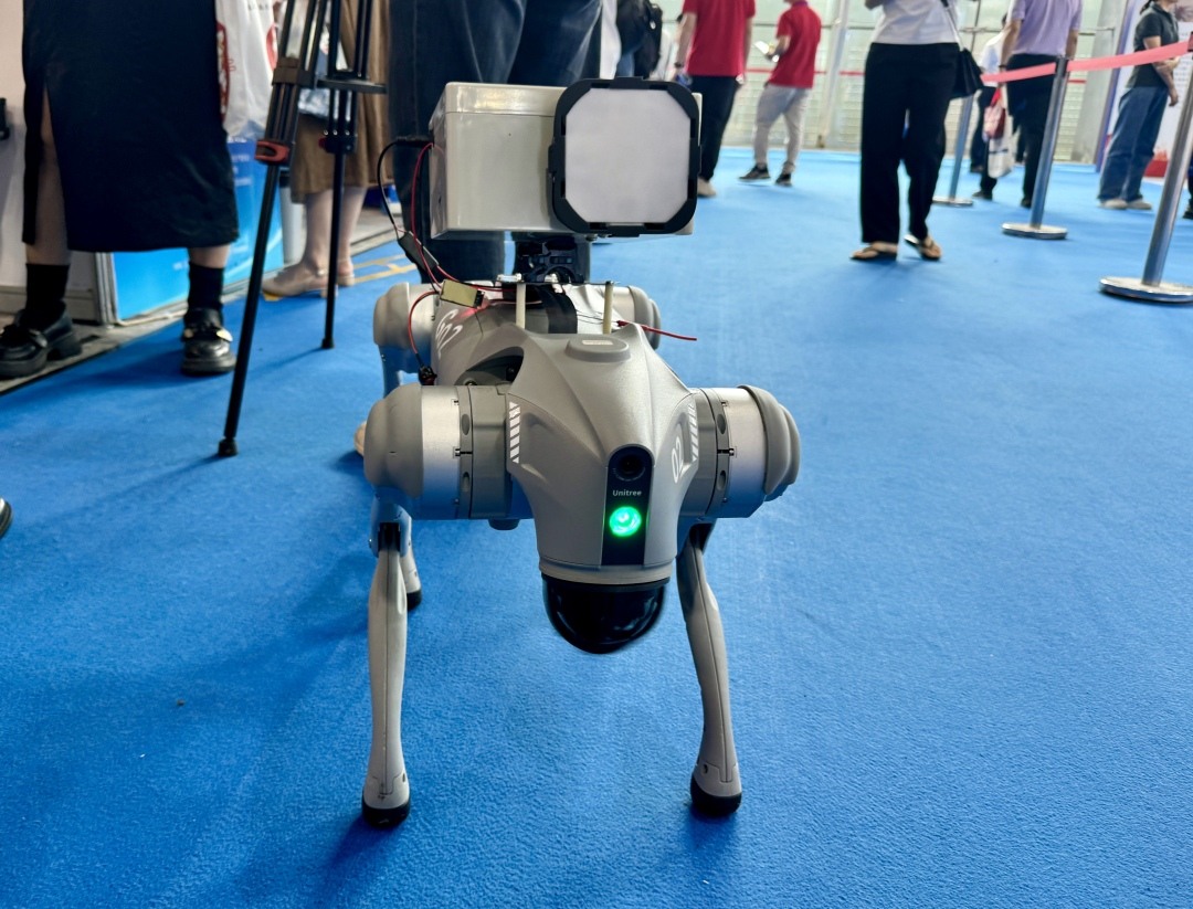 博览会首日,展区内的一只搭载电磁绳网抓捕器的“机器狗”吸引过往游客围观。记者在现场看到,“机器狗”在展区不仅可以快速地移动识别目标,而且不间断地安保巡逻。