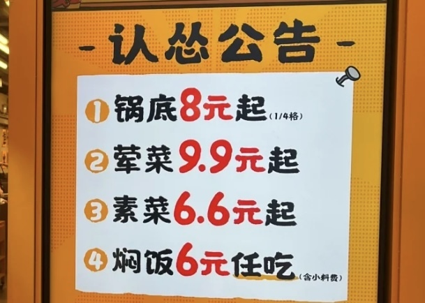 近日,怂火锅下调了部分菜品的价格。记者留意到,怂火锅门店前“认怂公告”更新为“锅底8.8元起、荤菜9.9元起、素菜6.6元起、焖饭6元任吃”。而此前该公告的内容为:“不是米其林、不是必吃榜、服务不如海底捞好、吃火锅你开心就好。”对此,怂火锅官方客服表示,这份公告为近期更新,怂火锅对部分菜品价格进行了下调,菜品规格也有所浮动。