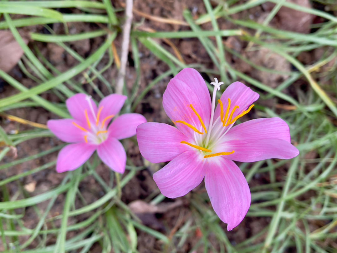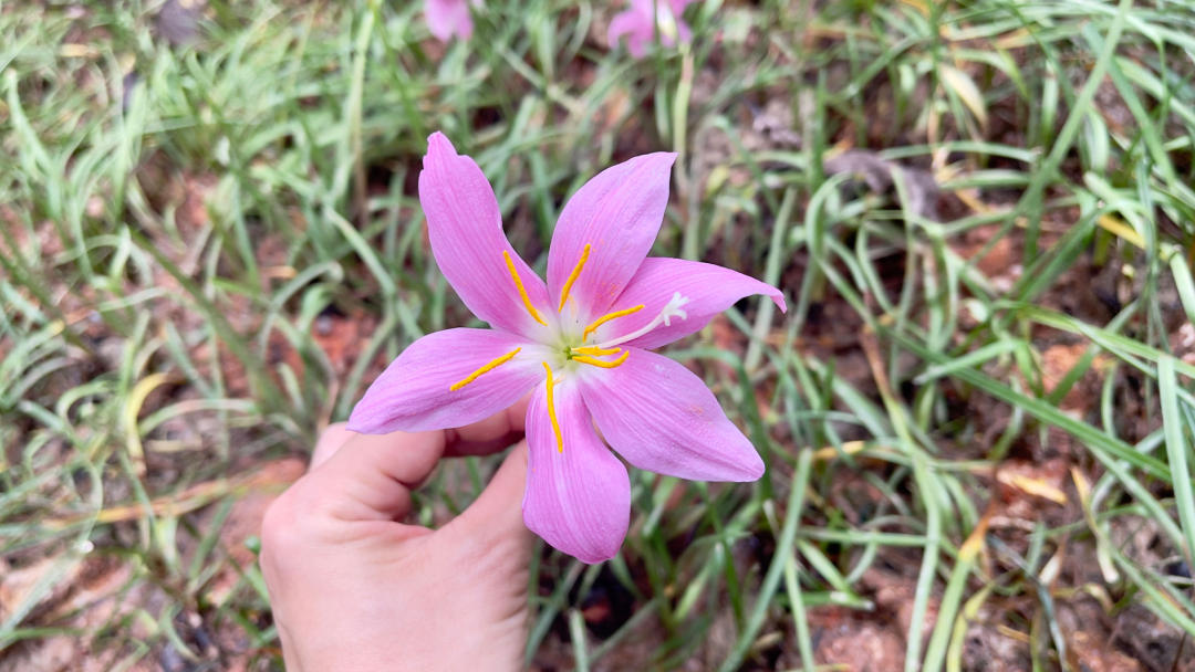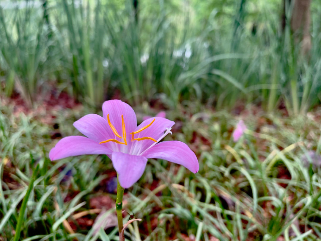 每年夏季6至八月,韭莲都会在一场场风雨中,开出一朵朵小小的花来。它的花单生于花茎顶端,下有佛焰苞状总苞,总苞片常带淡紫红色,花冠漏斗状,花瓣呈玫瑰红色或粉红色。由于生长在葱葱郁郁的草地上,淹没在绿意之中,韭莲的花朵因花色娇俏更显灵动。