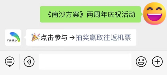 ②在“广州南沙发布”公众号后台发送“《南沙方案》两周年庆祝活动”关键词,点击进入抽奖小程序,根据指引操作,即可参与抽奖。