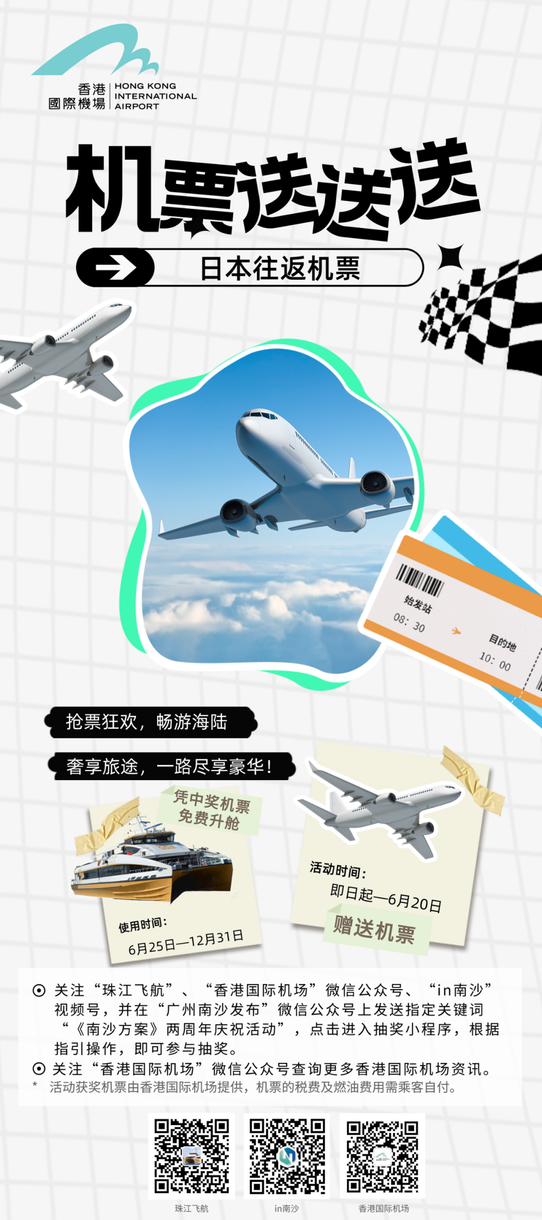 ①此次活动为公众号粉丝福利,参与活动前请先关注“in南沙”视频号、“珠江飞航”公众号、“香港国际机场”公众号;