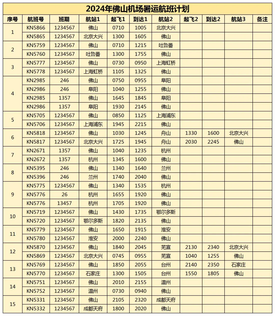据佛山机场介绍,2024年暑运期间,佛山机场全面提高开通航线的航班密度。根据目前计划,航班密度较高的航点有北京(每天3班,均为“大兴”)、上海(每天2班,1班“浦东”、1班“虹桥”)、杭州(每天2班,均为“萧山”),其余各航点均达到每天1班,后续将根据市场需求对航线和航班时刻进行优化调整,进一步满足广大旅客的出行需求。