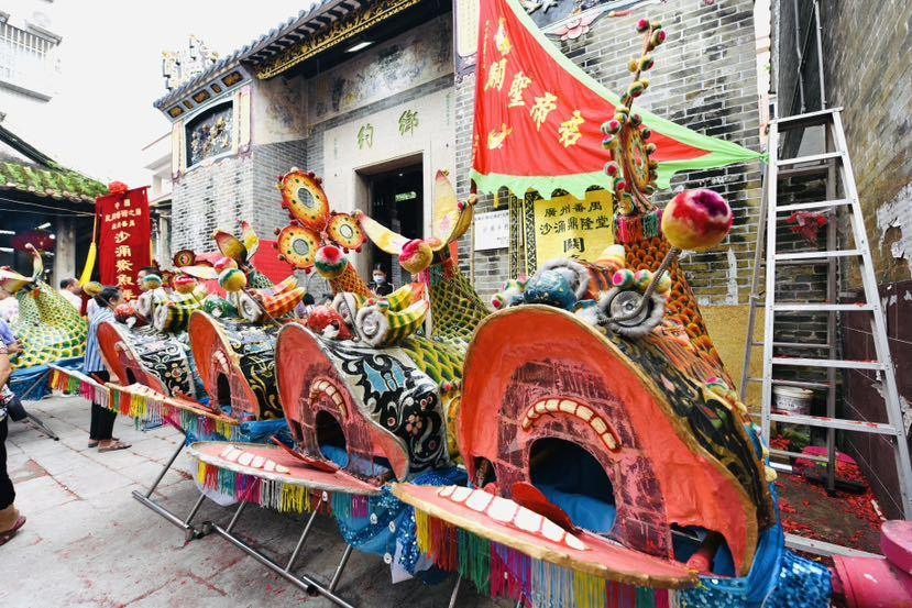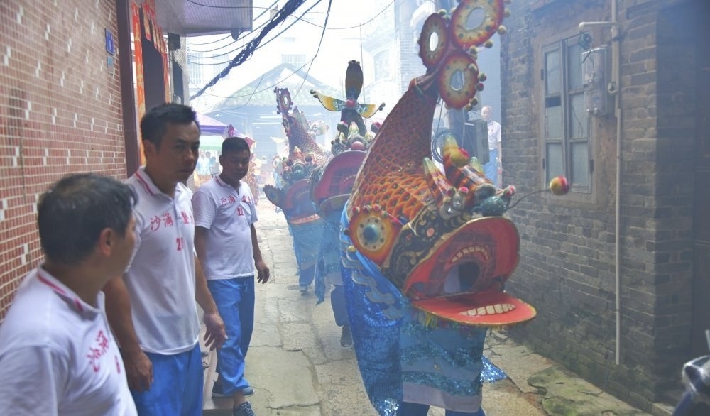 鳌鱼舞,作为番禺地区独有的民间传统舞蹈艺术,拥有六百多年的历史。活动当天,沙涌村鳌鱼舞传承人江绍成带队,8条栩栩如生的大鳌鱼在早上10点准时从村委会出发。巡游队伍穿梭于村内,途经南屏路、北帝庙、广琚祖等地,一路敲锣打鼓,人声鼎沸,10点30分来到关帝庙前,举行拜关帝仪式,祈求风调雨顺、国泰民安。
