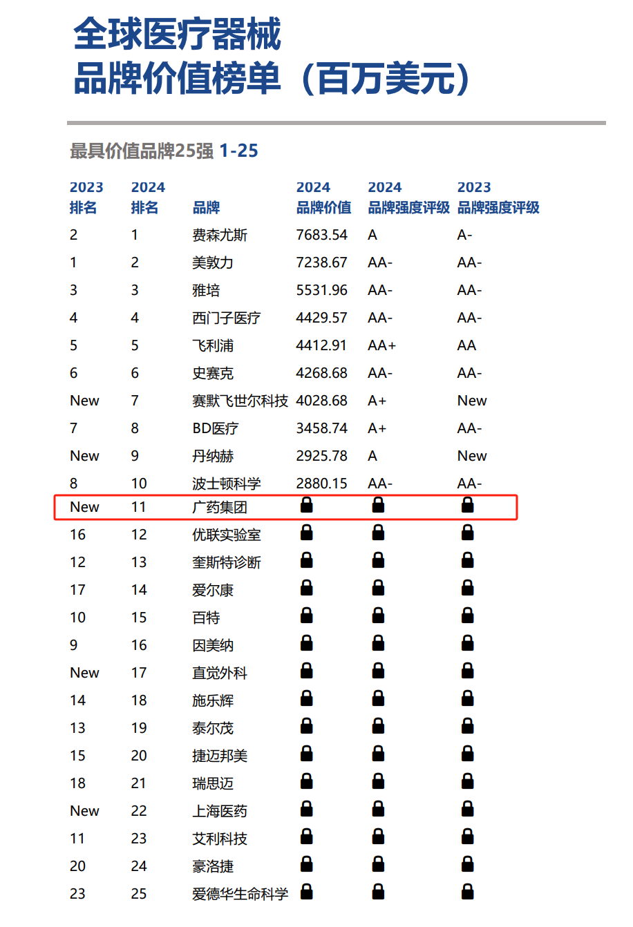 据了解,Brand Finance是全球领先的品牌估值及咨询公司,其发布的年度全球最具价值品牌榜单被广泛认为是衡量品牌实力和市场影响力的权威指标。此次上榜的国药集团、上海医药及云南白药三家中国医药公司的品牌价值有不同程度回落。在这种情况下,广药集团品牌价值上涨11.3%,位列入榜的中国医药品牌第2名,全球第16名,与国药品牌的排名进一步缩小差距。除此之外,今年广药集团首次跻身Brand Finance发布的全球最具价值医疗器械品牌榜单,位列全球第11名。